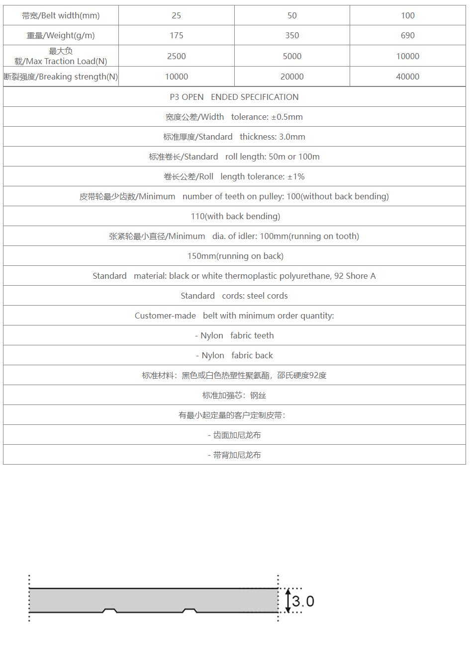 产品介绍: 聚氨酯同步带的结构由带背,抗拉层(钢丝芯或凯夫拉线芯),带齿三部分组成,带成品为连续长度,中间有与两边平行的钢丝芯,有良好的柔韧性和耐曲折性能,有很高的抗拉强度。